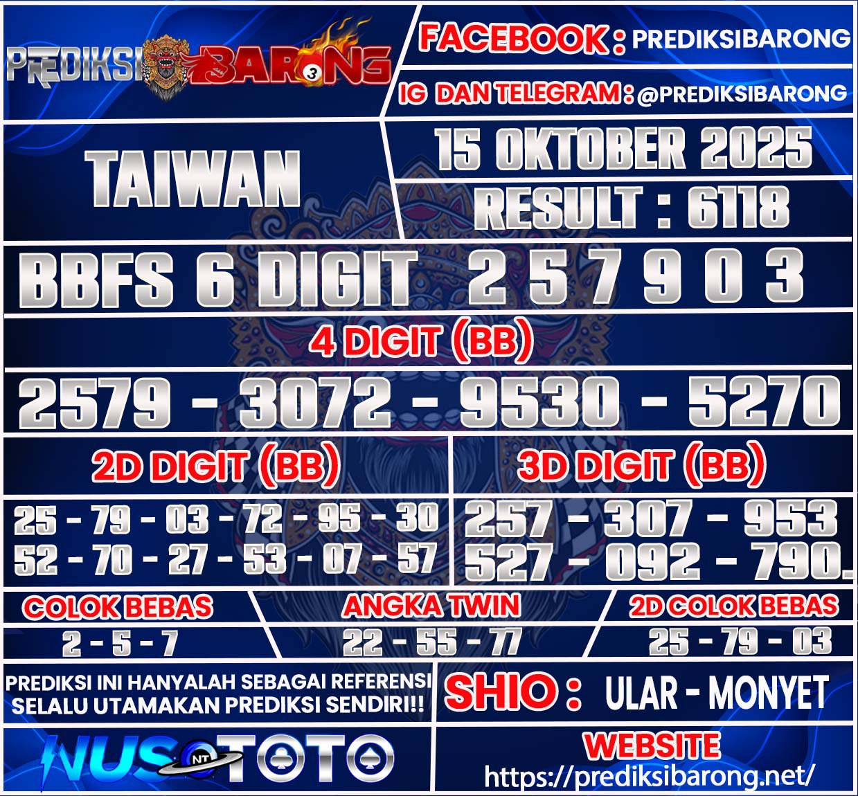 Selamat datang di Situs Prediksi Barong. Prediksi Barong merupakan situs prediksi angka togel yang berasal dari situs togel terpercaya dan teramanah yaitu NUSTOTO. Prediksi Barong sendiri sudah berdiri dari tahun 2018 hingga sekarang dan kualitasnya sudah di uji oleh para ahli paito dan pecinta togel resmi. Hari ini Prediksi Barong telah menyediakan Prediksi TAIWAN Rabu 15  Oktober 2025 untuk anda semuanya.