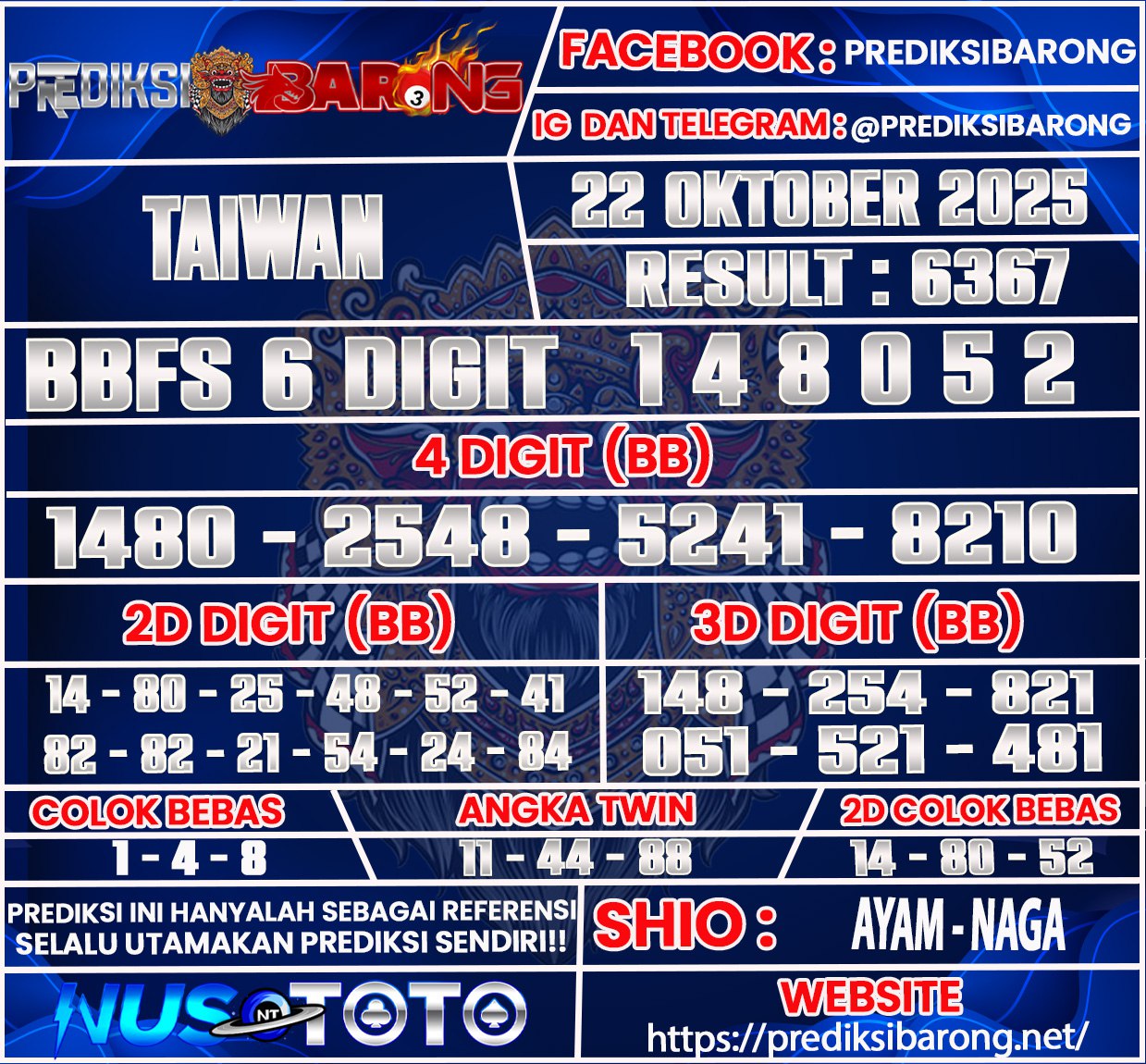 Prediksi Barong adalah layanan prediksi togel yang dirancang khusus untuk membantu para pemain togel dalam meraih keberuntungan. Pada edisi kali ini, kami menyajikan prediksi togel untuk pasar TAIWAN pada Rabu 22 Oktober 2025. Dengan analisis mendalam dan metode yang telah teruji, kami berusaha memberikan angka-angka yang memiliki potensi tinggi untuk keluar. Prediksi ini tidak hanya berdasarkan keberuntungan semata, tetapi juga menggunakan data statistik dan pola permainan sebelumnya yang dapat memberikan wawasan lebih bagi para pemain.