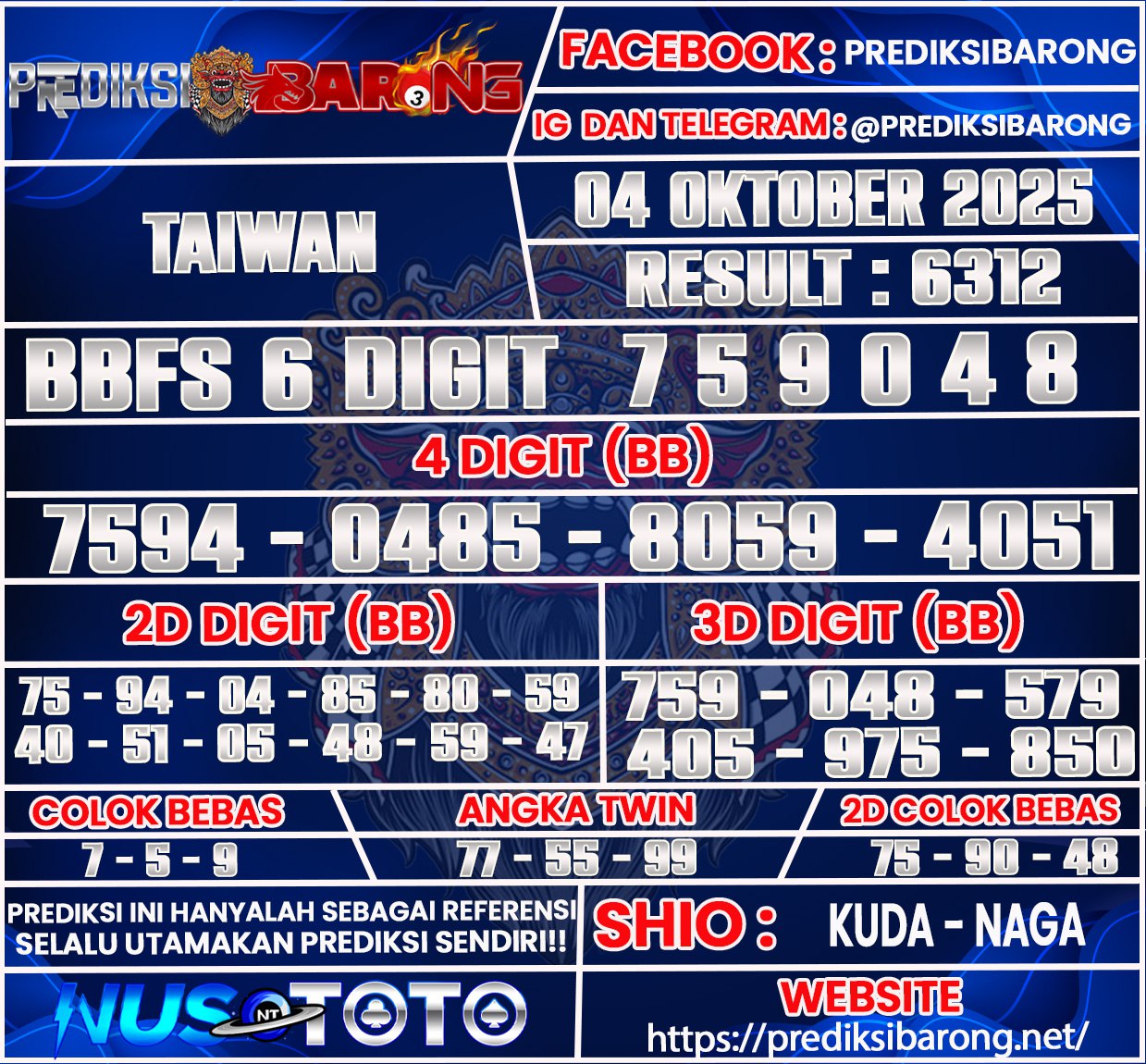 Selamat datang di Situs Prediksi Barong. Prediksi Barong merupakan situs prediksi angka togel yang berasal dari situs togel terpercaya dan teramanah yaitu NUSTOTO. Prediksi Barong sendiri sudah berdiri dari tahun 2018 hingga sekarang dan kualitasnya sudah di uji oleh para ahli paito dan pecinta togel resmi. Hari ini Prediksi Barong telah menyediakan Prediksi TAIWAN Sabtu 04 Oktober 2025 untuk anda semuanya.