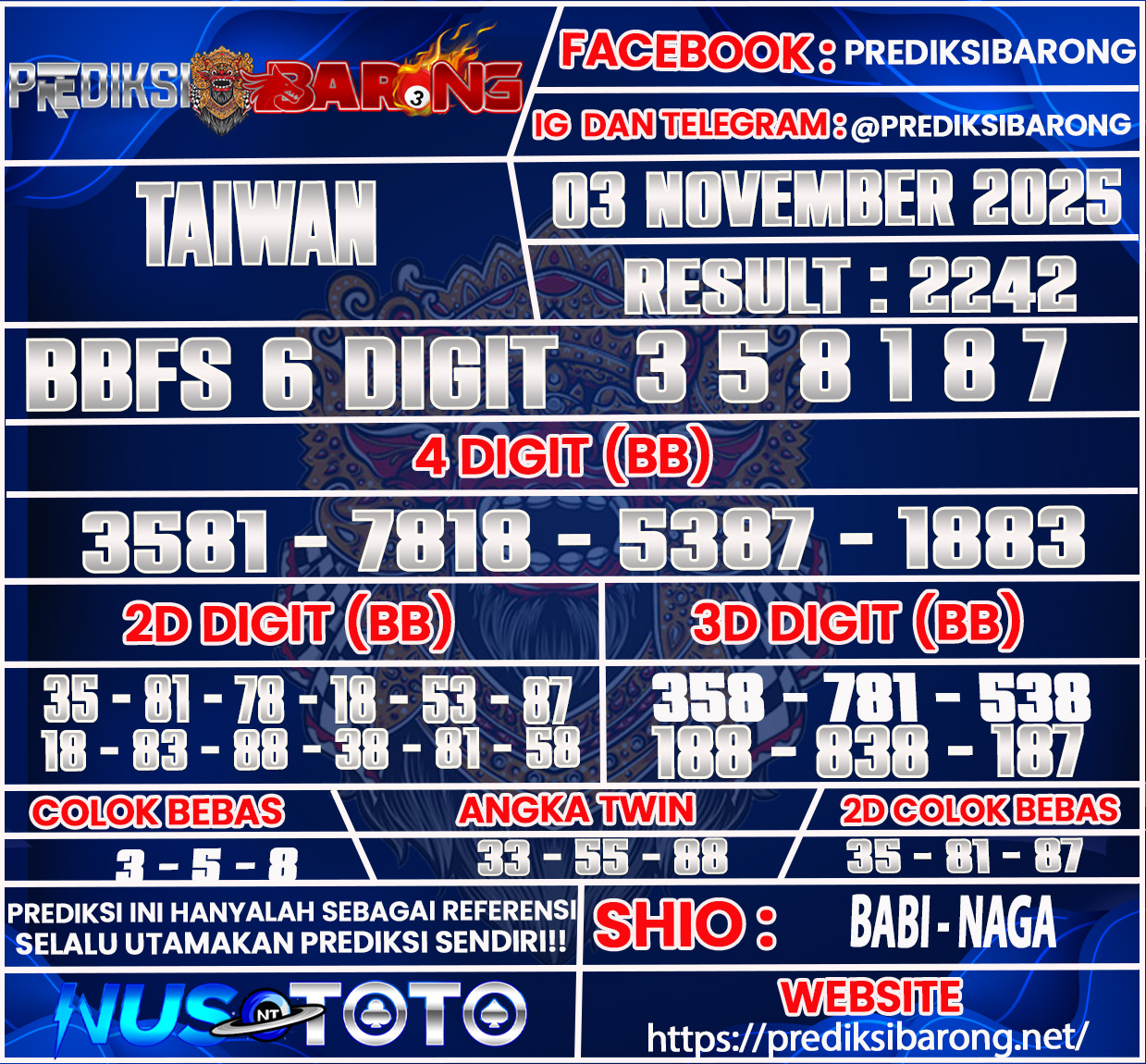 Prediksi Barong adalah layanan prediksi togel yang dirancang khusus untuk membantu para pemain togel dalam meraih keberuntungan. Pada edisi kali ini, kami menyajikan prediksi togel untuk pasar TAIWAN pada Rabu 22 Oktober 2025. Dengan analisis mendalam dan metode yang telah teruji, kami berusaha memberikan angka-angka yang memiliki potensi tinggi untuk keluar. Prediksi ini tidak hanya berdasarkan keberuntungan semata, tetapi juga menggunakan data statistik dan pola permainan sebelumnya yang dapat memberikan wawasan lebih bagi para pemain.