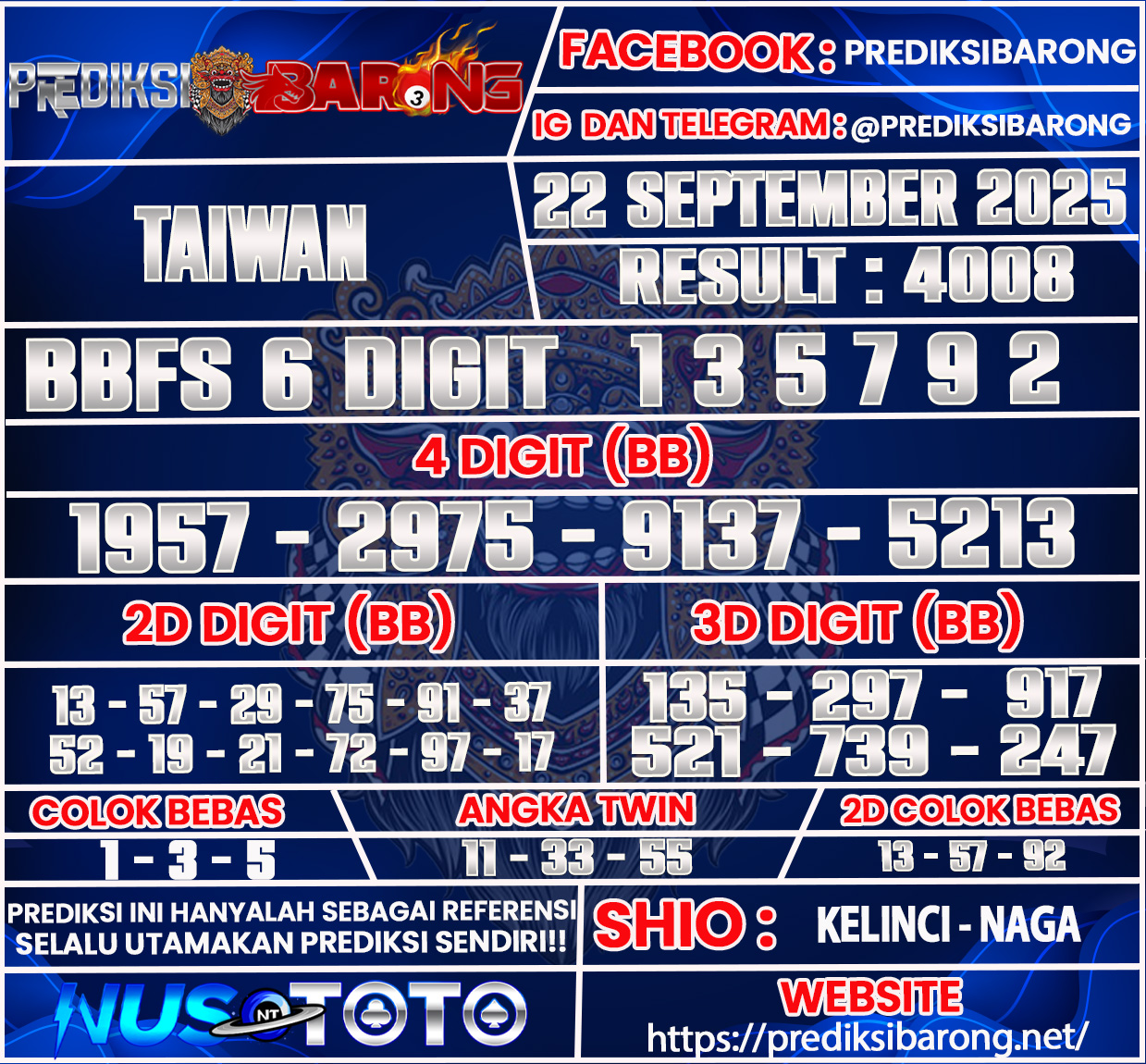 Prediksi Barong adalah layanan prediksi togel yang dirancang khusus untuk membantu para pemain togel dalam meraih keberuntungan. Pada edisi kali ini, kami menyajikan prediksi togel untuk pasar TAIWAN pada Senin 22 September 2025. Dengan analisis mendalam dan metode yang telah teruji, kami berusaha memberikan angka-angka yang memiliki potensi tinggi untuk keluar. Prediksi ini tidak hanya berdasarkan keberuntungan semata, tetapi juga menggunakan data statistik dan pola permainan sebelumnya yang dapat memberikan wawasan lebih bagi para pemain.