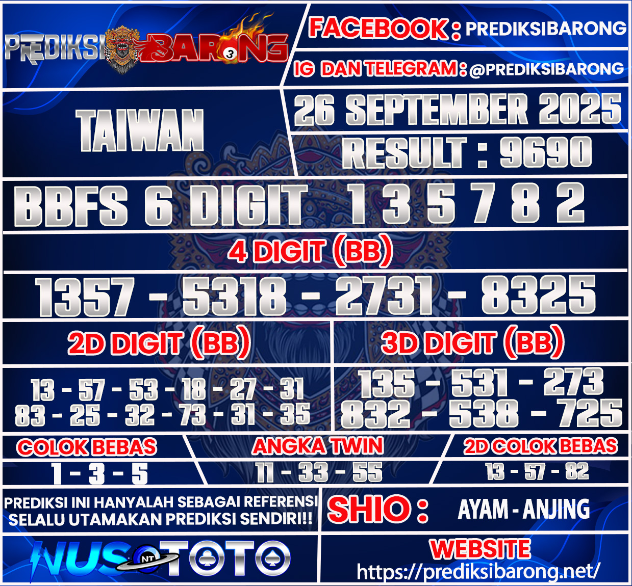 Selamat datang di Situs Prediksi Barong. Prediksi Barong merupakan situs prediksi angka togel yang berasal dari situs togel terpercaya dan teramanah yaitu NUSTOTO. Prediksi Barong sendiri sudah berdiri dari tahun 2018 hingga sekarang dan kualitasnya sudah di uji oleh para ahli paito dan pecinta togel resmi. Hari ini Prediksi Barong telah menyediakan Prediksi TAIWAN Jumat 26  September 2025 untuk anda semuanya.