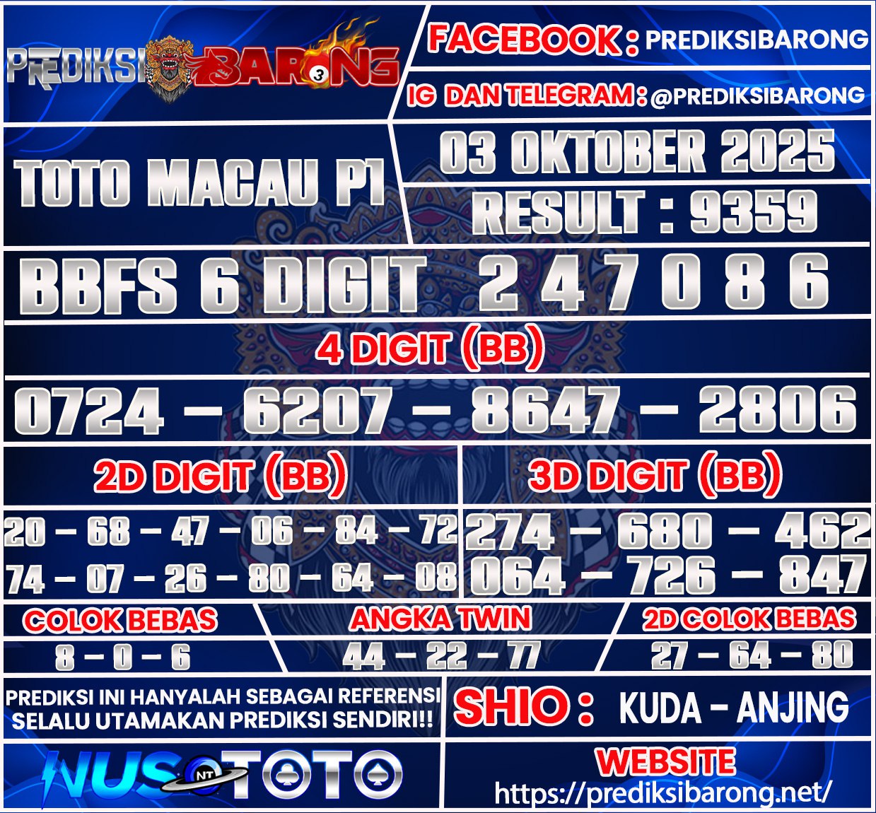Selamat datang di Situs Prediksi Barong. Prediksi Barong merupakan situs prediksi angka togel yang berasal dari situs togel terpercaya dan teramanah yaitu NUSTOTO. Prediksi Barong sendiri sudah berdiri dari tahun 2018 hingga sekarang dan kualitasnya sudah di uji oleh para ahli paito dan pecinta togel resmi. Hari ini Prediksi Barong telah menyediakan Prediksi Toto Macau P1 Jumat 03 Oktober 2025 untuk anda semuanya.