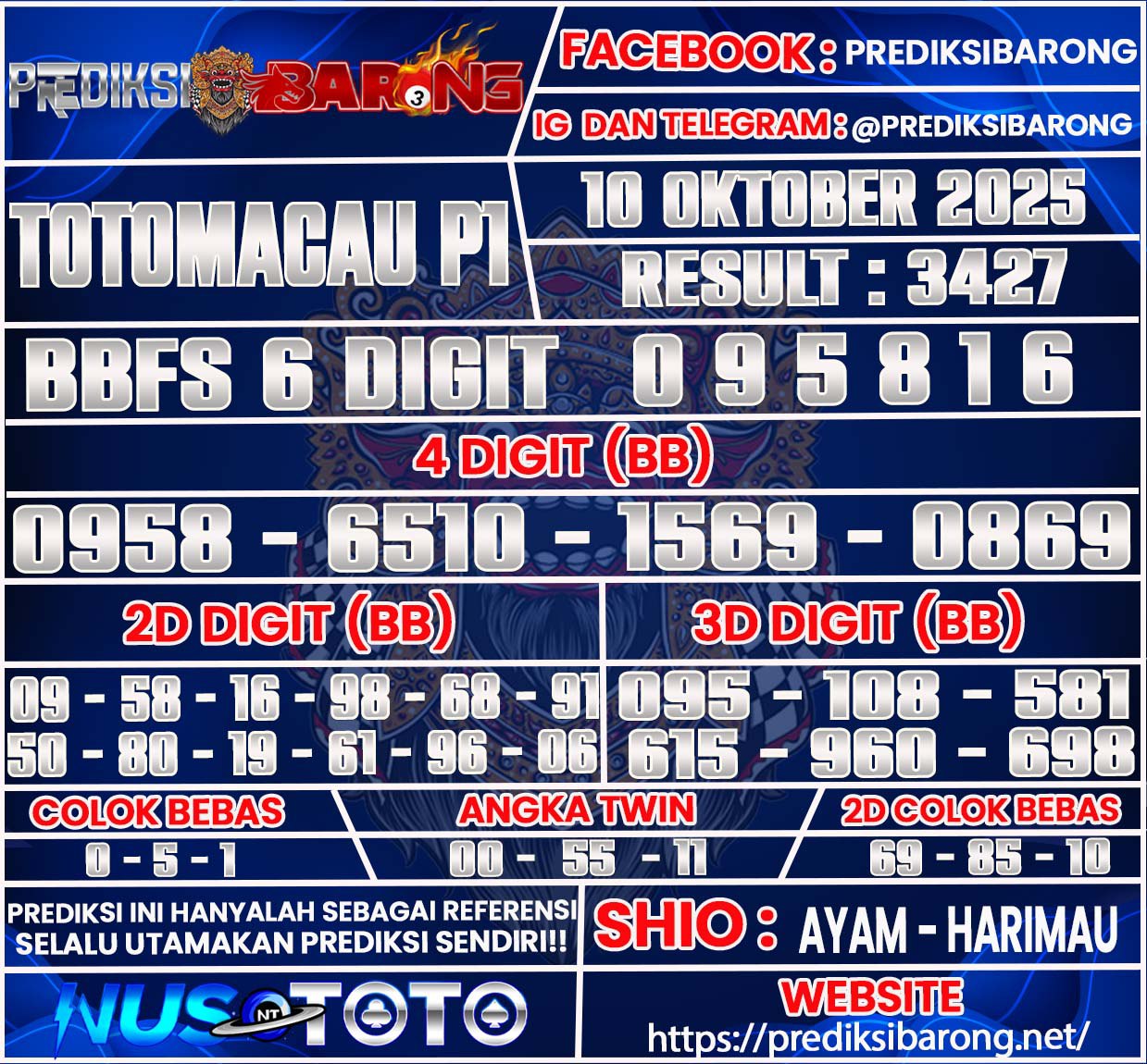 Prediksi Barong adalah layanan prediksi togel yang dirancang khusus untuk membantu para pemain togel dalam meraih keberuntungan. Pada edisi kali ini, kami menyajikan prediksi togel untuk pasar Toto Macau P1 pada hari Jumat 10 Oktober 2025. Dengan analisis mendalam dan metode yang telah teruji, kami berusaha memberikan angka-angka yang memiliki potensi tinggi untuk keluar. Prediksi ini tidak hanya berdasarkan keberuntungan semata, tetapi juga menggunakan data statistik dan pola permainan sebelumnya yang dapat memberikan wawasan lebih bagi para pemain.