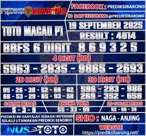Prediksi Barong adalah layanan prediksi togel yang dirancang khusus untuk membantu para pemain togel dalam meraih keberuntungan. Pada edisi kali ini, kami menyajikan prediksi togel untuk pasar Toto Macau P1 pada hari Jumat 19 September 2025. Dengan analisis mendalam dan metode yang telah teruji, kami berusaha memberikan angka-angka yang memiliki potensi tinggi untuk keluar. Prediksi ini tidak hanya berdasarkan keberuntungan semata, tetapi juga menggunakan data statistik dan pola permainan sebelumnya yang dapat memberikan wawasan lebih bagi para pemain.
