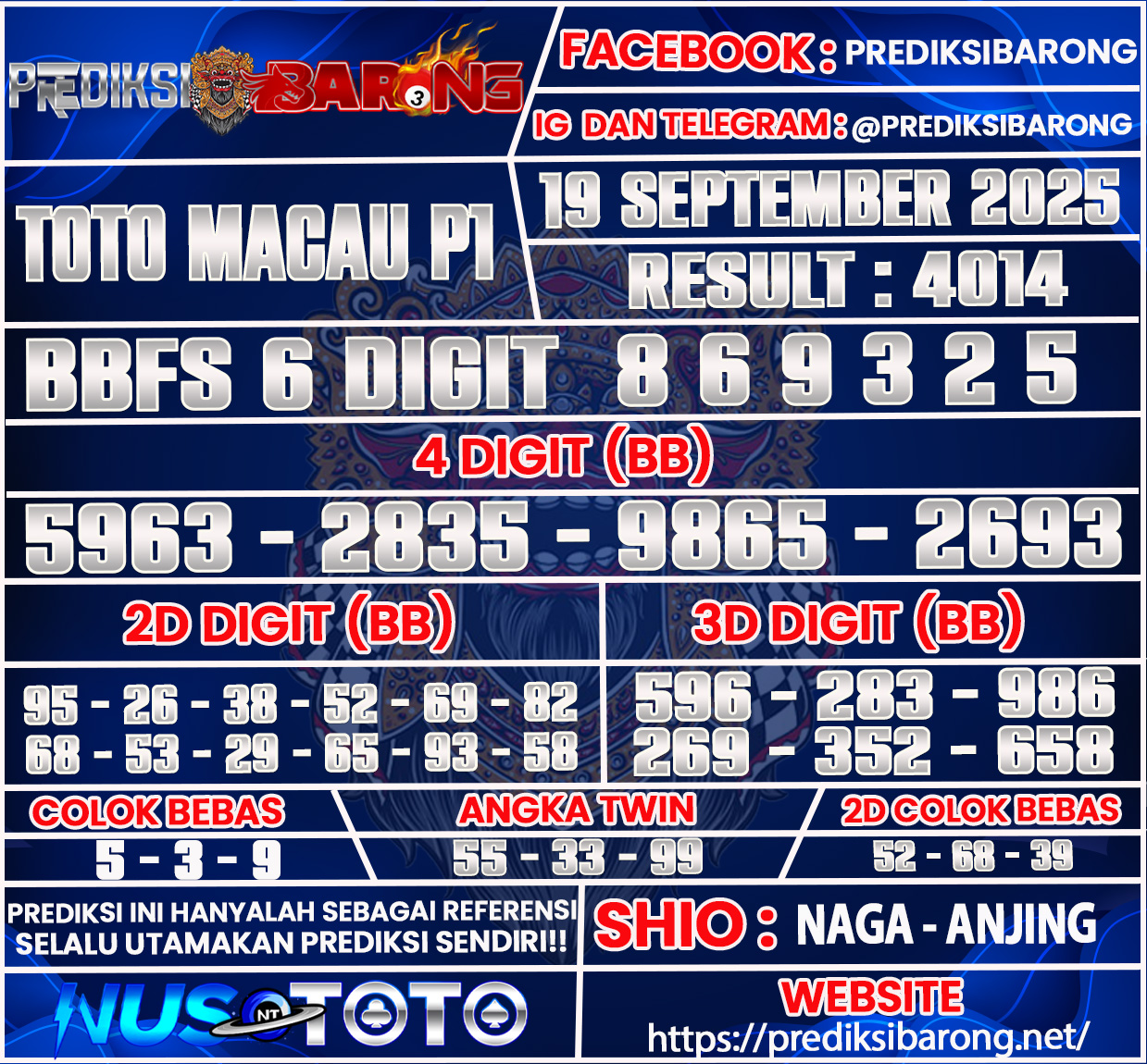 Selamat datang di Situs Prediksi Barong. Prediksi Barong merupakan situs prediksi angka togel yang berasal dari situs togel terpercaya dan teramanah yaitu NUSTOTO. Prediksi Barong sendiri sudah berdiri dari tahun 2018 hingga sekarang dan kualitasnya sudah di uji oleh para ahli paito dan pecinta togel resmi. Hari ini Prediksi Barong telah menyediakan Prediksi Toto Macau P1 Jumat 19 September 2025 untuk anda semuanya.