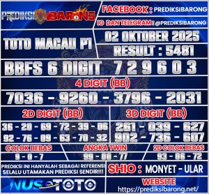 Prediksi Barong adalah layanan prediksi togel yang dirancang khusus untuk membantu para pemain togel dalam meraih keberuntungan. Pada edisi kali ini, kami menyajikan prediksi togel untuk pasar Toto Macau P1 pada hari Rabu 01 Oktober 2025. Dengan analisis mendalam dan metode yang telah teruji, kami berusaha memberikan angka-angka yang memiliki potensi tinggi untuk keluar. Prediksi ini tidak hanya berdasarkan keberuntungan semata, tetapi juga menggunakan data statistik dan pola permainan sebelumnya yang dapat memberikan wawasan lebih bagi para pemain.