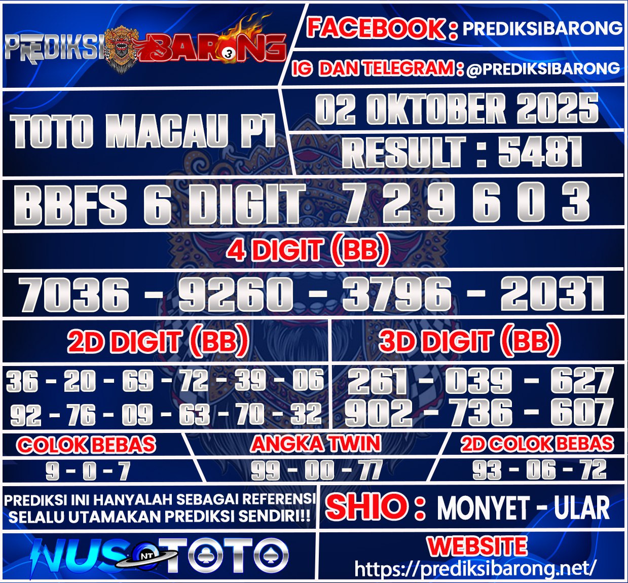Selamat datang di Situs Prediksi Barong. Prediksi Barong merupakan situs prediksi angka togel yang berasal dari situs togel terpercaya dan teramanah yaitu NUSTOTO. Prediksi Barong sendiri sudah berdiri dari tahun 2018 hingga sekarang dan kualitasnya sudah di uji oleh para ahli paito dan pecinta togel resmi. Hari ini Prediksi Barong telah menyediakan Prediksi Toto Macau P1 Rabu 01 Oktober 2025 untuk anda semuanya.