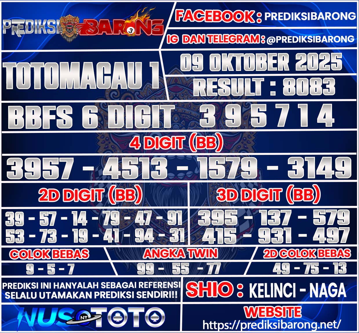 elamat datang di Situs Prediksi Barong. Prediksi Barong merupakan situs prediksi angka togel yang berasal dari situs togel terpercaya dan teramanah yaitu NUSTOTO. Prediksi Barong sendiri sudah berdiri dari tahun 2018 hingga sekarang dan kualitasnya sudah di uji oleh para ahli paito dan pecinta togel resmi. Hari ini Prediksi Barong telah menyediakan Prediksi Toto Macau P1 Kamis 09 Oktober 2025 untuk anda semuanya.