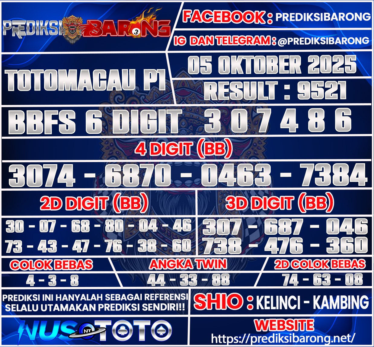 Selamat datang di Situs Prediksi Barong. Prediksi Barong merupakan situs prediksi angka togel yang berasal dari situs togel terpercaya dan teramanah yaitu NUSTOTO. Prediksi Barong sendiri sudah berdiri dari tahun 2018 hingga sekarang dan kualitasnya sudah di uji oleh para ahli paito dan pecinta togel resmi. Hari ini Prediksi Barong telah menyediakan Prediksi Toto Macau P1 Minggu 05 Oktober 2025 untuk anda semuanya.