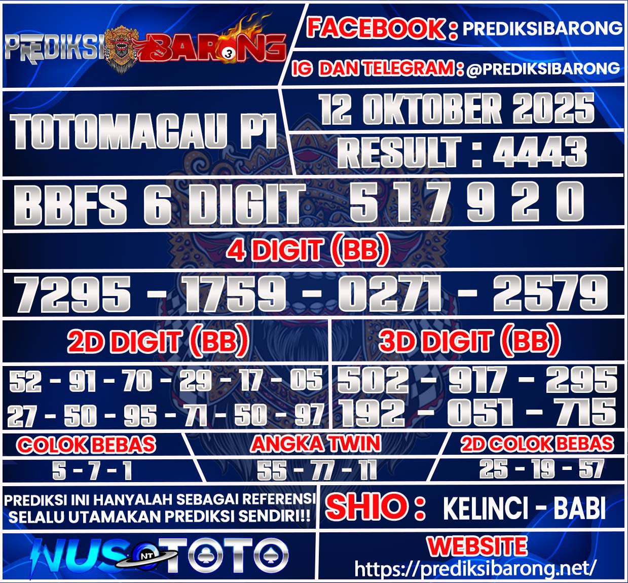 Selamat datang di Situs Prediksi Barong. Prediksi Barong merupakan situs prediksi angka togel yang berasal dari situs togel terpercaya dan teramanah yaitu NUSTOTO. Prediksi Barong sendiri sudah berdiri dari tahun 2018 hingga sekarang dan kualitasnya sudah di uji oleh para ahli paito dan pecinta togel resmi. Hari ini Prediksi Barong telah menyediakan Prediksi Toto Macau P1 Sabtu 11Oktober 2025 untuk anda semuanya.