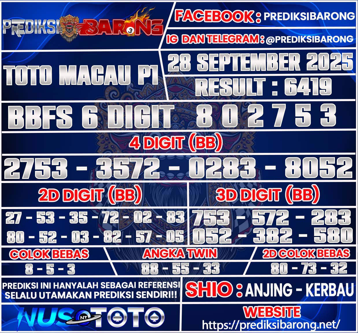 Prediksi Barong adalah layanan prediksi togel yang dirancang khusus untuk membantu para pemain togel dalam meraih keberuntungan. Pada edisi kali ini, kami menyajikan prediksi togel untuk pasar Toto Macau P1 pada hari Minggu 28  September 2025. Dengan analisis mendalam dan metode yang telah teruji, kami berusaha memberikan angka-angka yang memiliki potensi tinggi untuk keluar. Prediksi ini tidak hanya berdasarkan keberuntungan semata, tetapi juga menggunakan data statistik dan pola permainan sebelumnya yang dapat memberikan wawasan lebih bagi para pemain.