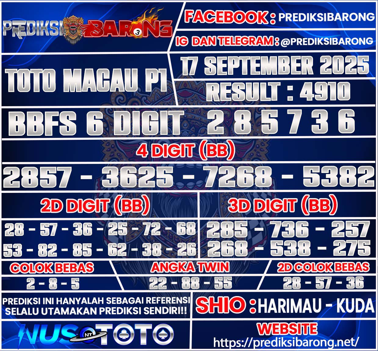 Prediksi Barong adalah layanan prediksi togel yang dirancang khusus untuk membantu para pemain togel dalam meraih keberuntungan. Pada edisi kali ini, kami menyajikan prediksi togel untuk pasar Toto Macau P1 pada hari Rabu 17  September 2025. Dengan analisis mendalam dan metode yang telah teruji, kami berusaha memberikan angka-angka yang memiliki potensi tinggi untuk keluar. Prediksi ini tidak hanya berdasarkan keberuntungan semata, tetapi juga menggunakan data statistik dan pola permainan sebelumnya yang dapat memberikan wawasan lebih bagi para pemain.