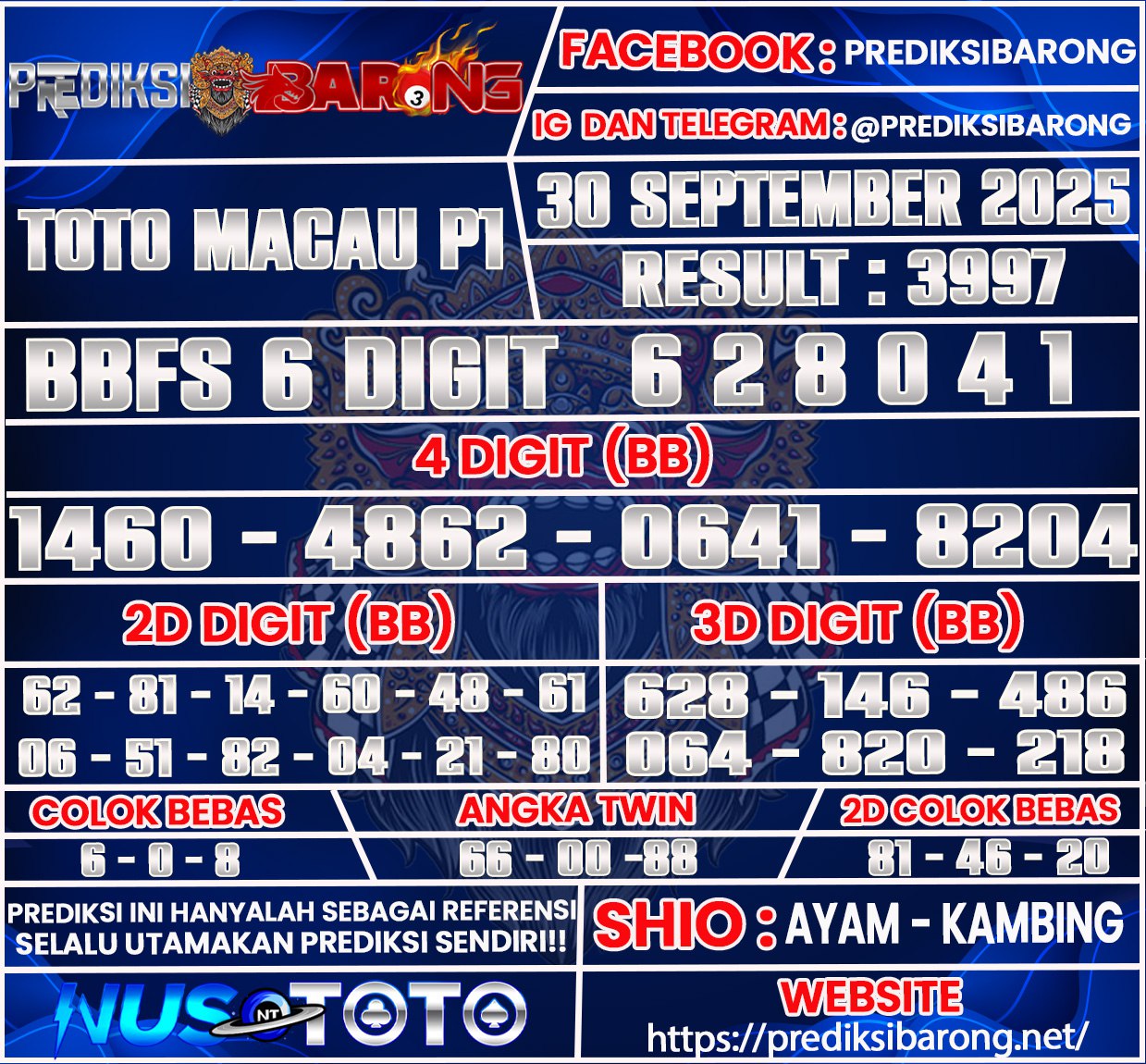 Selamat datang di Situs Prediksi Barong. Prediksi Barong merupakan situs prediksi angka togel yang berasal dari situs togel terpercaya dan teramanah yaitu NUSTOTO. Prediksi Barong sendiri sudah berdiri dari tahun 2018 hingga sekarang dan kualitasnya sudah di uji oleh para ahli paito dan pecinta togel resmi. Hari ini Prediksi Barong telah menyediakan Prediksi Toto Macau P1 Selasa 30   September 2025 untuk anda semuanya.