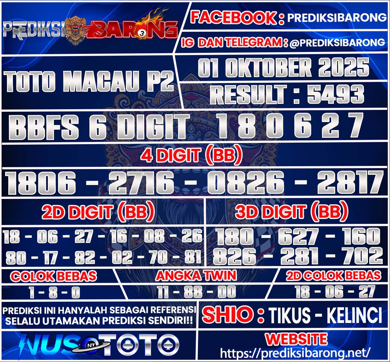 Selamat datang di Situs Prediksi Barong. Prediksi Barong merupakan situs prediksi angka togel yang berasal dari situs togel terpercaya dan teramanah yaitu NUSTOTO. Prediksi Barong sendiri sudah berdiri dari tahun 2019 hingga sekarang dan kualitasnya sudah di uji oleh para ahli paito dan pecinta togel resmi. Hari ini Prediksi Barong telah menyediakan Prediksi Toto Macau P2 Rabu 01 Oktober 2025 untuk anda semuanya.