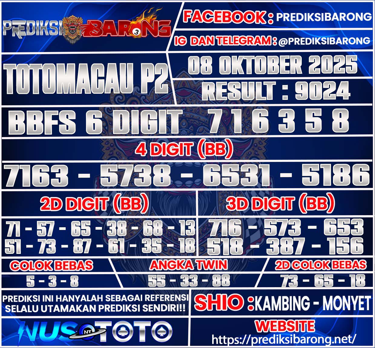 Selamat datang di Situs Prediksi Barong. Prediksi Barong merupakan situs prediksi angka togel yang berasal dari situs togel terpercaya dan teramanah yaitu NUSTOTO. Prediksi Barong sendiri sudah berdiri dari tahun 2019 hingga sekarang dan kualitasnya sudah di uji oleh para ahli paito dan pecinta togel resmi. Hari ini Prediksi Barong telah menyediakan Prediksi Toto Macau P2 Rabu 08 Oktober 2025 untuk anda semuanya.