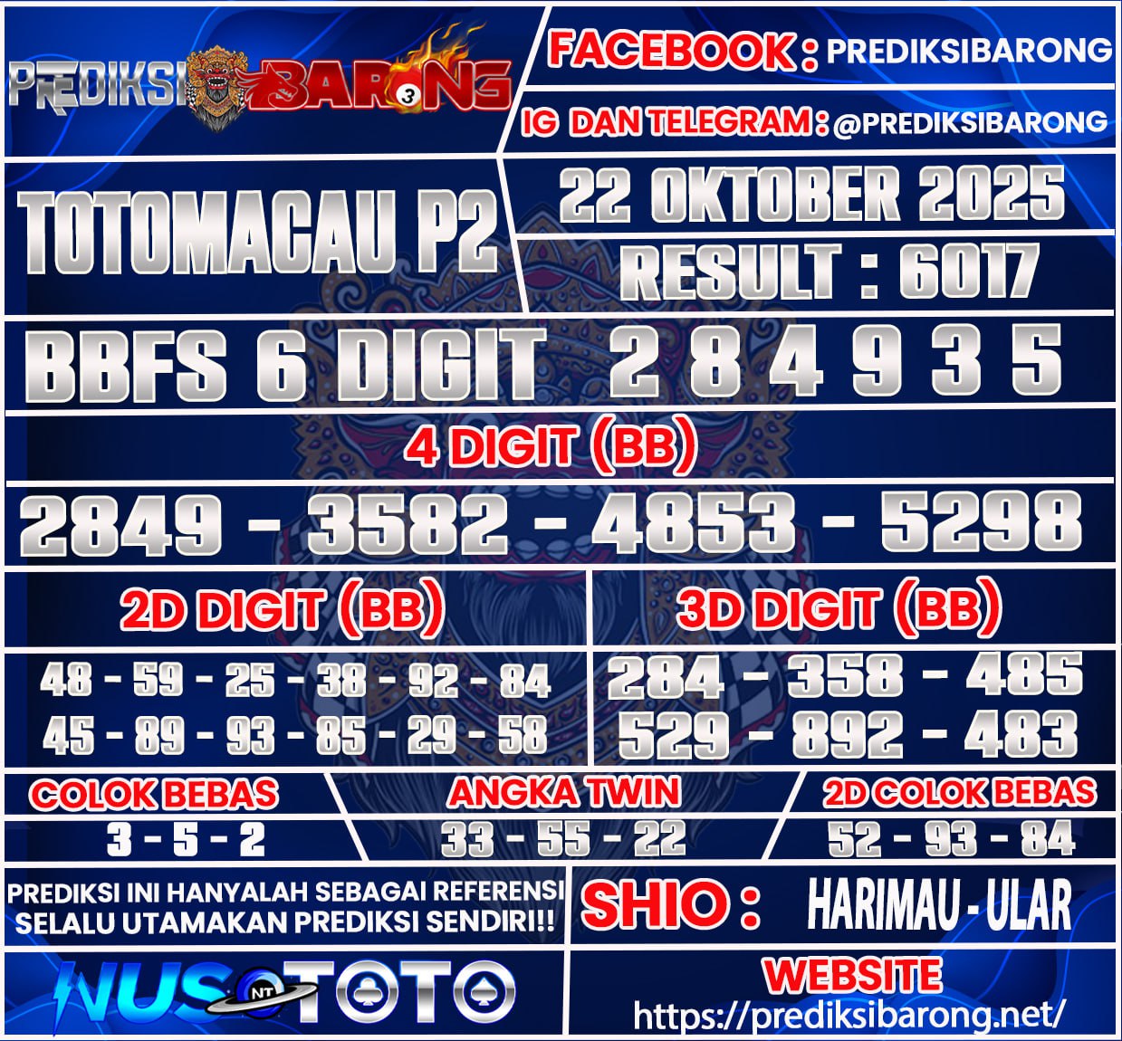 Oleh karena itu tanpa menunggu lama inilah Prediksi Toto Macau P2 Rabu tanggal 22  Oktober 2025 Dari Prediksi Barong :