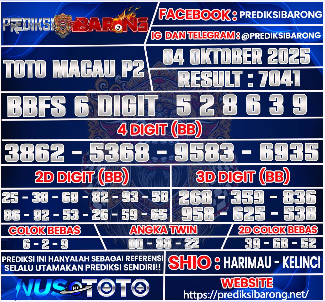 Selamat datang di Situs Prediksi Barong. Prediksi Barong merupakan situs prediksi angka togel yang berasal dari situs togel terpercaya dan teramanah yaitu NUSTOTO. Prediksi Barong sendiri sudah berdiri dari tahun 2019 hingga sekarang dan kualitasnya sudah di uji oleh para ahli paito dan pecinta togel resmi. Hari ini Prediksi Barong telah menyediakan Prediksi Toto Macau P2 Sabtu 04 Oktober 2025 untuk anda semuanya.