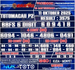 Prediksi Barong adalah layanan prediksi togel yang dirancang khusus untuk membantu para pemain togel dalam meraih keberuntungan. Pada edisi kali ini, kami menyajikan prediksi togel untuk pasar Toto Macau p2 pada hari Sabtu 11 Oktober 2025. Dengan analisis mendalam dan metode yang telah teruji, kami berusaha memberikan angka-angka yang memiliki potensi tinggi untuk keluar. Prediksi ini tidak hanya berdasarkan keberuntungan semata, tetapi juga menggunakan data statistik dan pola permainan sebelumnya yang dapat memberikan wawasan lebih bagi para pemain.