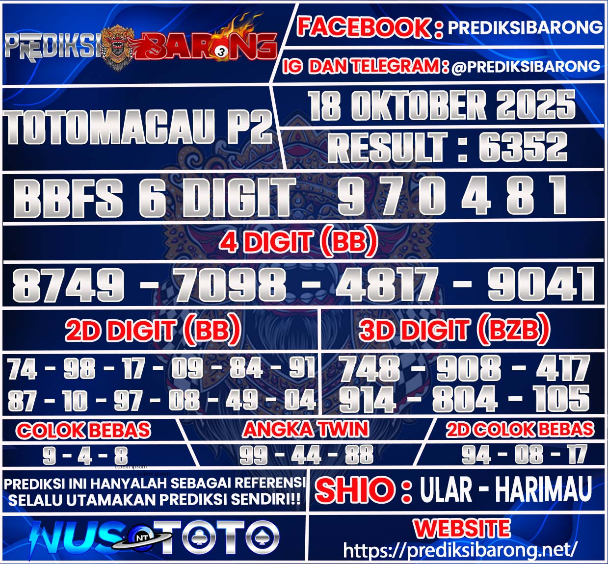 Prediksi Barong adalah layanan prediksi togel yang dirancang khusus untuk membantu para pemain togel dalam meraih keberuntungan. Pada edisi kali ini, kami menyajikan prediksi togel untuk pasar Toto Macau p2 pada hari Sabtu 18 Oktober 2025. Dengan analisis mendalam dan metode yang telah teruji, kami berusaha memberikan angka-angka yang memiliki potensi tinggi untuk keluar. Prediksi ini tidak hanya berdasarkan keberuntungan semata, tetapi juga menggunakan data statistik dan pola permainan sebelumnya yang dapat memberikan wawasan lebih bagi para pemain.