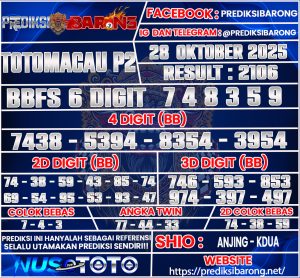 Prediksi Barong adalah layanan prediksi togel yang dirancang khusus untuk membantu para pemain togel dalam meraih keberuntungan. Pada edisi kali ini, kami menyajikan prediksi togel untuk pasar Toto Macau p2 pada hari Sabtu 18 Oktober 2025. Dengan analisis mendalam dan metode yang telah teruji, kami berusaha memberikan angka-angka yang memiliki potensi tinggi untuk keluar. Prediksi ini tidak hanya berdasarkan keberuntungan semata, tetapi juga menggunakan data statistik dan pola permainan sebelumnya yang dapat memberikan wawasan lebih bagi para pemain.