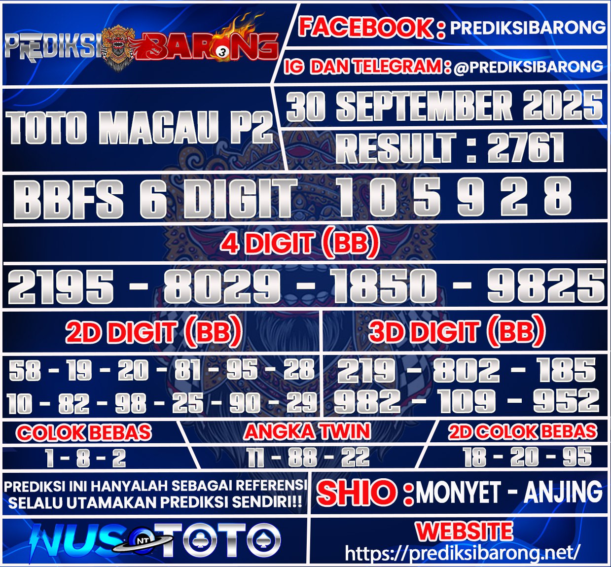Selamat datang di Situs Prediksi Barong. Prediksi Barong merupakan situs prediksi angka togel yang berasal dari situs togel terpercaya dan teramanah yaitu NUSTOTO. Prediksi Barong sendiri sudah berdiri dari tahun 2019 hingga sekarang dan kualitasnya sudah di uji oleh para ahli paito dan pecinta togel resmi. Hari ini Prediksi Barong telah menyediakan Prediksi Toto Macau P2 Selasa 30 September2025 untuk anda semuanya.