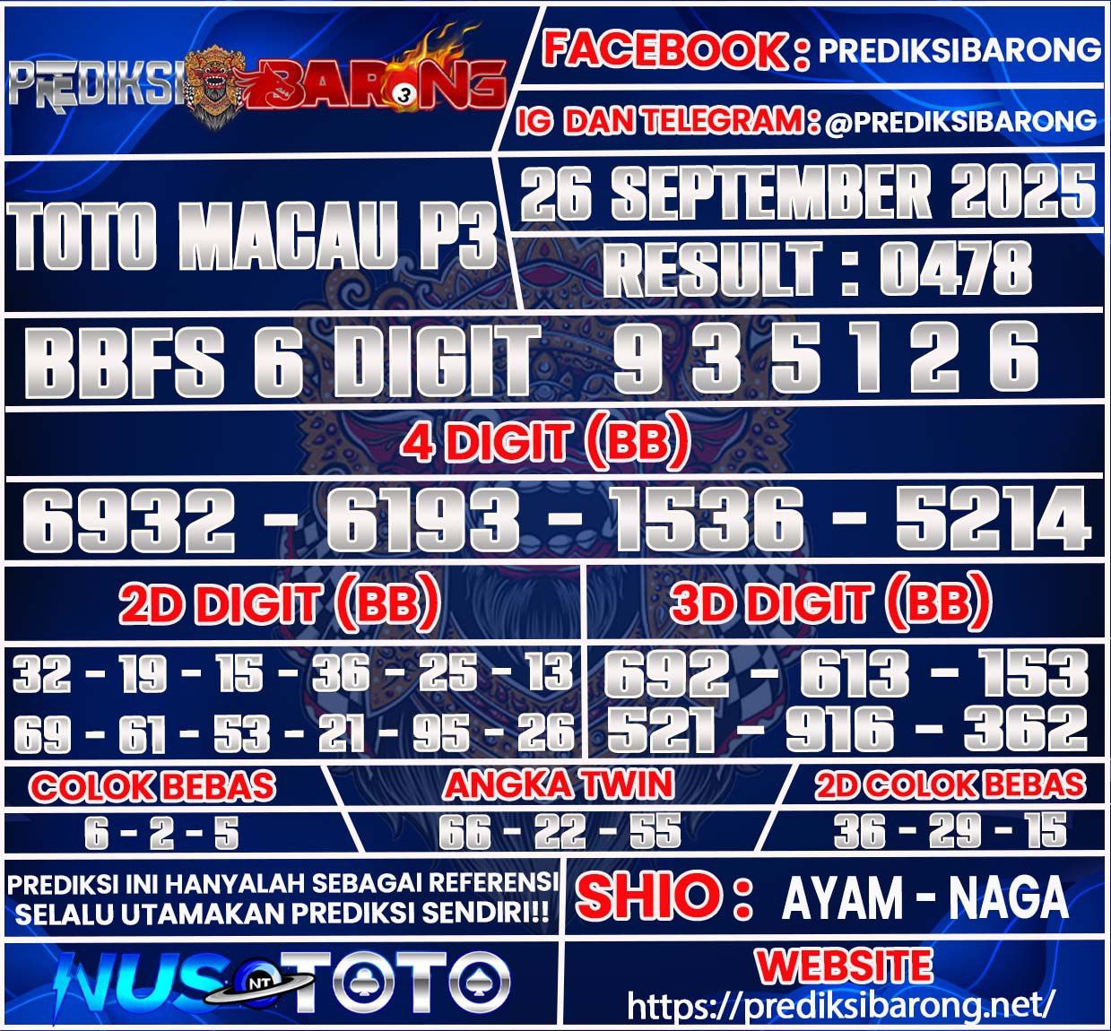 Prediksi Barong adalah layanan prediksi togel yang dirancang khusus untuk membantu para pemain togel dalam meraih keberuntungan. Pada edisi kali ini, kami menyajikan prediksi togel untuk pasar Toto Macau P3 pada hari Jumat 26 September 2025. Dengan analisis mendalam dan metode yang telah teruji, kami berusaha memberikan angka-angka yang memiliki potensi tinggi untuk keluar. Prediksi ini tidak hanya berdasarkan keberuntungan semata, tetapi juga menggunakan data statistik dan pola permainan sebelumnya yang dapat memberikan wawasan lebih bagi para pemain.