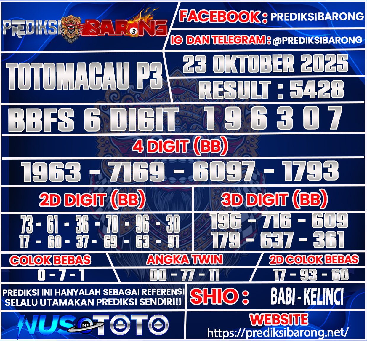 Selamat datang di Situs Prediksi Barong. Prediksi Barong merupakan situs prediksi angka togel yang berasal dari situs togel terpercaya dan teramanah yaitu NUSTOTO. Prediksi Barong sendiri sudah berdiri dari tahun 2018 hingga sekarang dan kualitasnya sudah di uji oleh para ahli paito dan pecinta togel resmi. Hari ini Prediksi Barong telah menyediakan Prediksi Toto Macau P3 Sabtu 18 Oktober 2025 untuk anda semuanya.