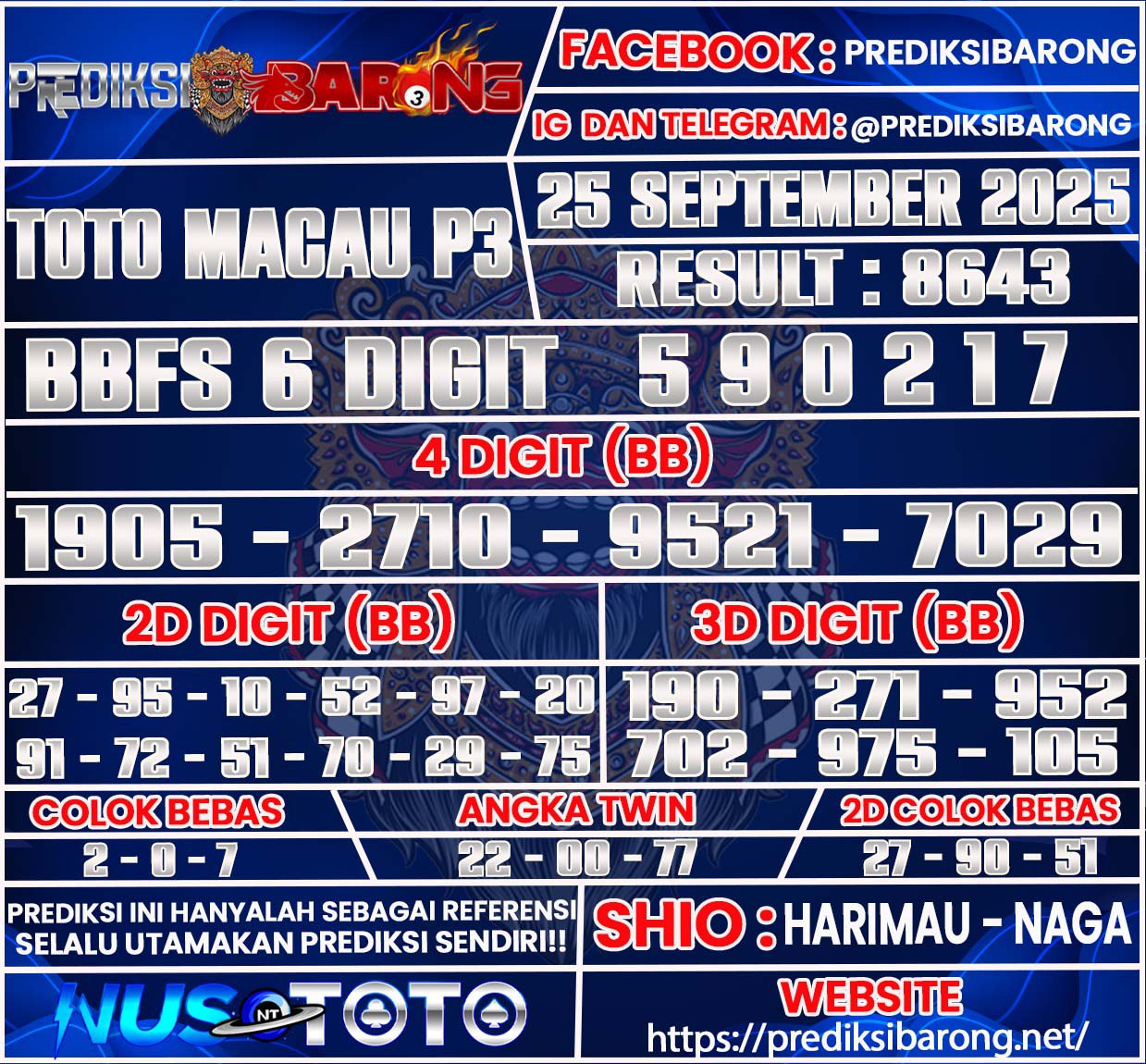 Oleh karena itu tanpa menunggu lama inilah Prediksi Toto Macau p3 Kamis Tanggal 25 September 2025 Dari Prediksi Barong :