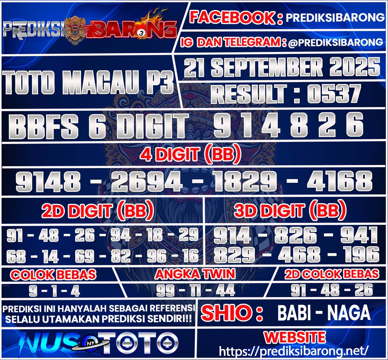 Selamat datang di Situs Prediksi Barong. Prediksi Barong merupakan situs prediksi angka togel yang berasal dari situs togel terpercaya dan teramanah yaitu NUSTOTO. Prediksi Barong sendiri sudah berdiri dari tahun 2018 hingga sekarang dan kualitasnya sudah di uji oleh para ahli paito dan pecinta togel resmi. Hari ini Prediksi Barong telah menyediakan Prediksi Toto Macau P3 Minggu 21 September 2025 untuk anda semuanya.