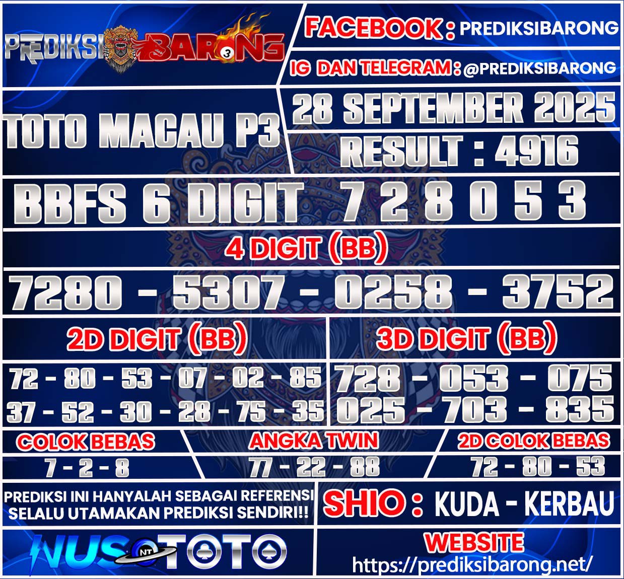 Oleh karena itu tanpa menunggu lama inilah Prediksi Toto Macau p3Minggu Tanggal 28 September 2025 Dari Prediksi Barong :