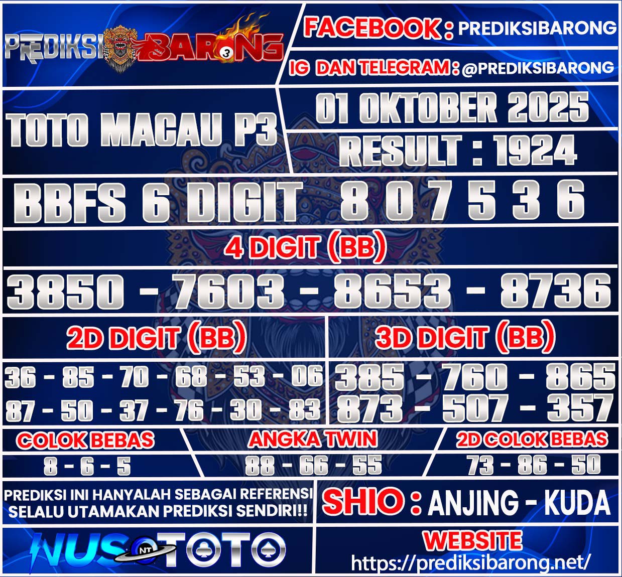 elamat datang di Situs Prediksi Barong. Prediksi Barong merupakan situs prediksi angka togel yang berasal dari situs togel terpercaya dan teramanah yaitu NUSTOTO. Prediksi Barong sendiri sudah berdiri dari tahun 2018 hingga sekarang dan kualitasnya sudah di uji oleh para ahli paito dan pecinta togel resmi. Hari ini Prediksi Barong telah menyediakan Prediksi Toto Macau P3 Rabu 01 Oktober 2025 untuk anda semuanya.