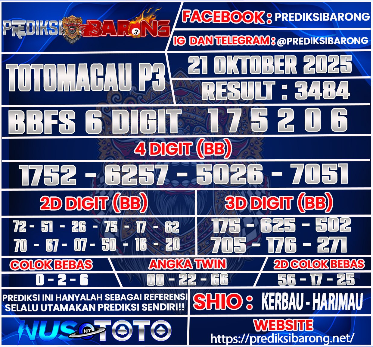 Prediksi Barong » Prediksi TOTO MACAU P3 Selasa 21 Oktober 2025