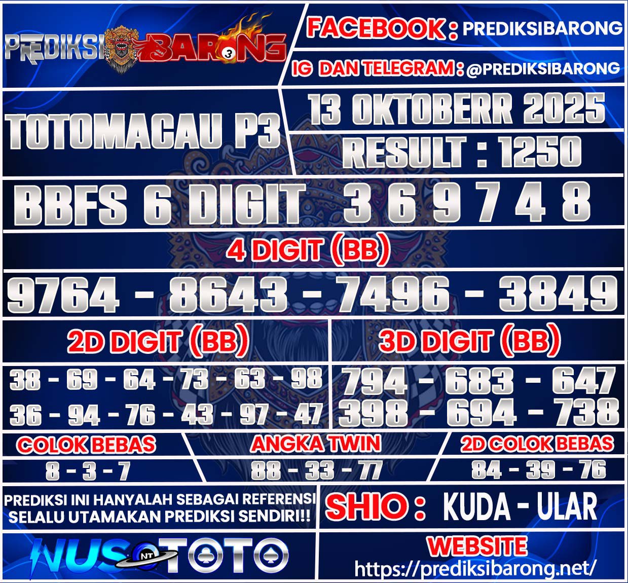 Oleh karena itu tanpa menunggu lama inilah Prediksi Toto Macau p3 Senin tanggal 13 Oktober 2025 Dari Prediksi Barong :