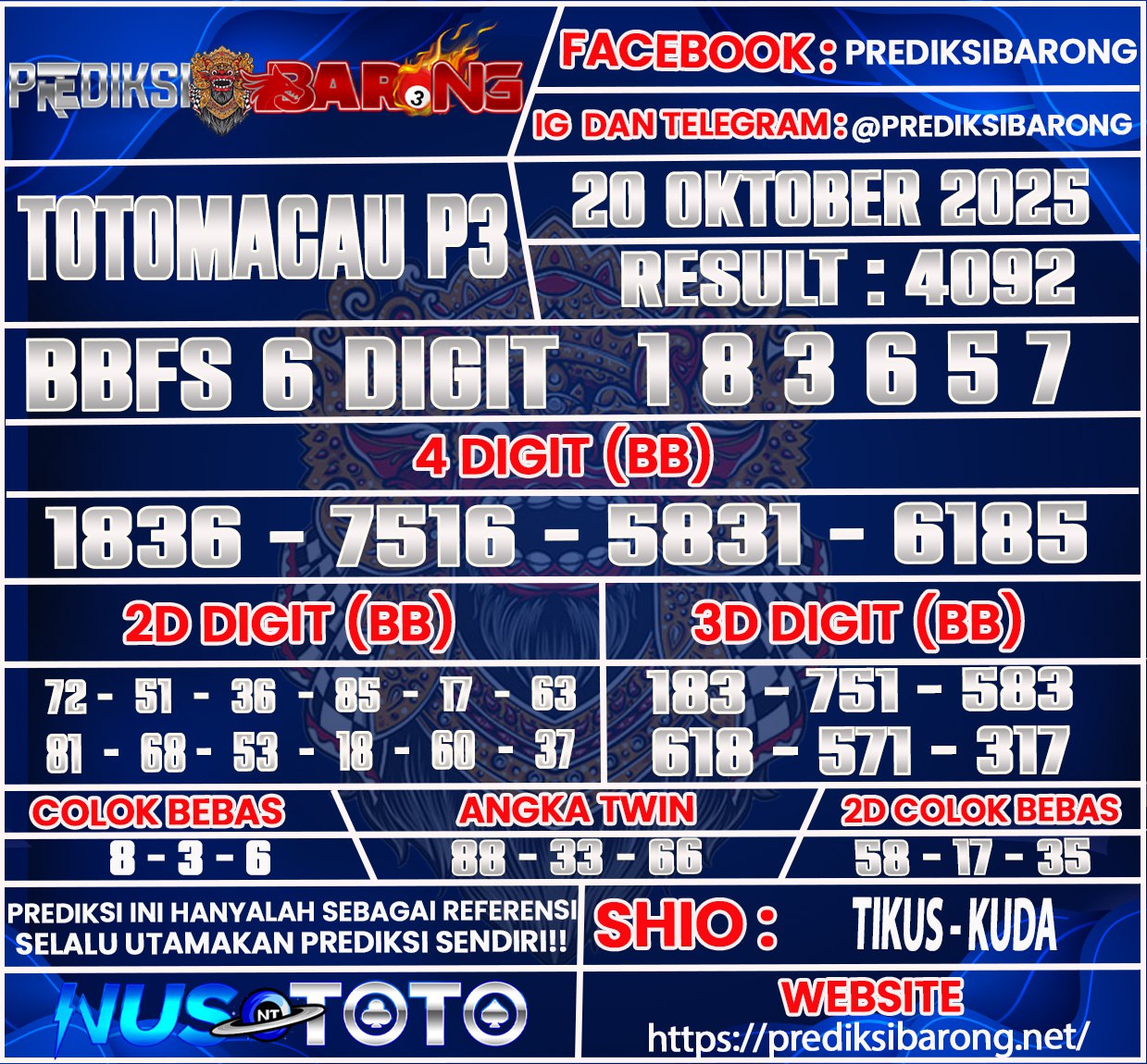 Selamat datang di Situs Prediksi Barong. Prediksi Barong merupakan situs prediksi angka togel yang berasal dari situs togel terpercaya dan teramanah yaitu NUSTOTO. Prediksi Barong sendiri sudah berdiri dari tahun 2018 hingga sekarang dan kualitasnya sudah di uji oleh para ahli paito dan pecinta togel resmi. Hari ini Prediksi Barong telah menyediakan Prediksi Toto Macau P3 Sabtu 18 Oktober 2025 untuk anda semuanya.
