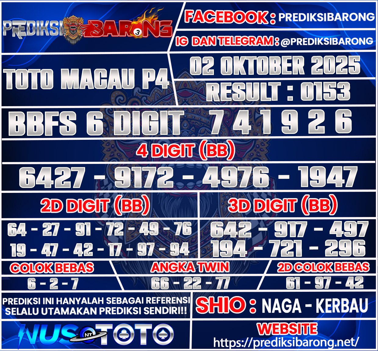 slamat datang di Situs Prediksi Barong. Prediksi Barong merupakan situs prediksi angka togel yang berasal dari situs togel terpercaya dan teramanah yaitu NUSTOTO. Prediksi Barong sendiri sudah berdiri dari tahun 2018 hingga sekarang dan kualitasnya sudah di uji oleh para ahli paito dan pecinta togel resmi. Hari ini Prediksi Barong telah menyediakan Prediksi Toto Macau P4 Rabu 01 Oktober 2025 untuk anda semuanya.Apa Itu Prediksi Barong?