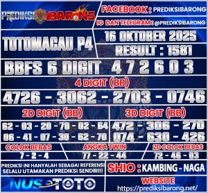 Prediksi Barong adalah layanan prediksi togel yang dirancang khusus untuk membantu para pemain togel dalam meraih keberuntungan. Pada edisi kali ini, kami menyajikan prediksi togel untuk pasar Toto Macau P4 pada hari Rabu 15 Oktober 2025. Dengan analisis mendalam dan metode yang telah terji, kami berusaha memberikan angka-angka yang memiliki potensi tinggi untuk keluar. Prediksi ini tidak hanya berdasarkan keberuntungan semata, tetapi juga menggunakan data statistik dan pola permainan sebelumnya yang dapat memberikan wawasan lebih bagi para pemain.