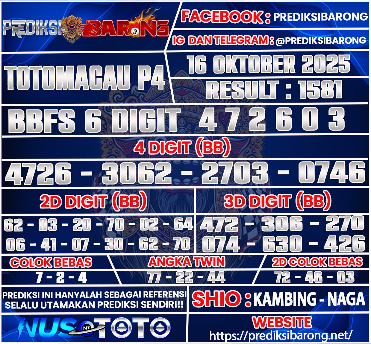 Oleh karena itu tanpa menunggu lama inilah Prediksi Toto Macau P4 Kamis Tanggal 16 tober 2025 Dari Prediksi Barong