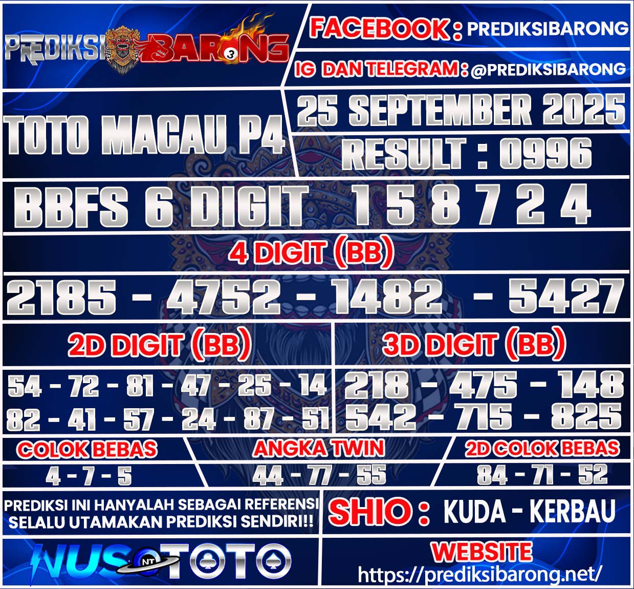 Oleh karena itu tanpa menunggu lama inilah Prediksi Toto Macau P4 Kamis Tanggal 25 September 2025 Dari Prediksi  Barong