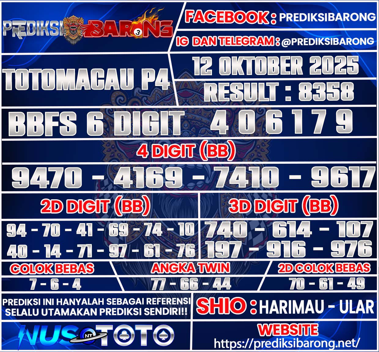 Oleh karena itu tanpa menunggu lama inilah Prediksi Toto Macau P4 Minggu tanggal 12 ktober 2025 Dari Prediksi Barong