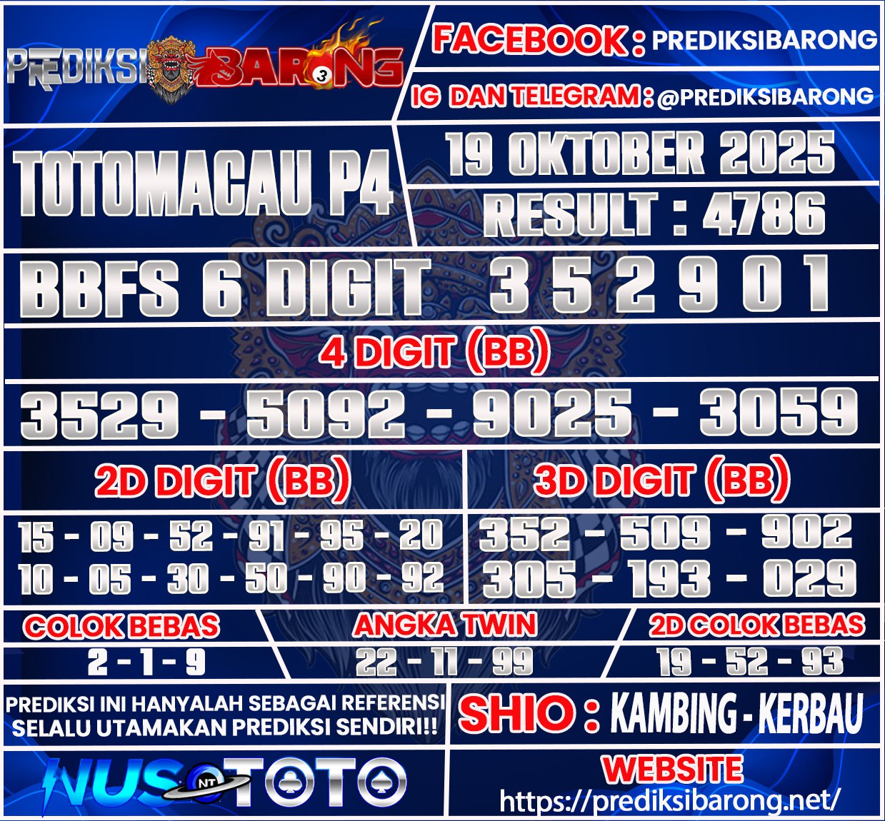 Oleh karena itu tanpa menunggu lama inilah Prediksi Toto Macau P4 Minggu tanggal 19  Oktober 2025 Dari Prediksi Barong :