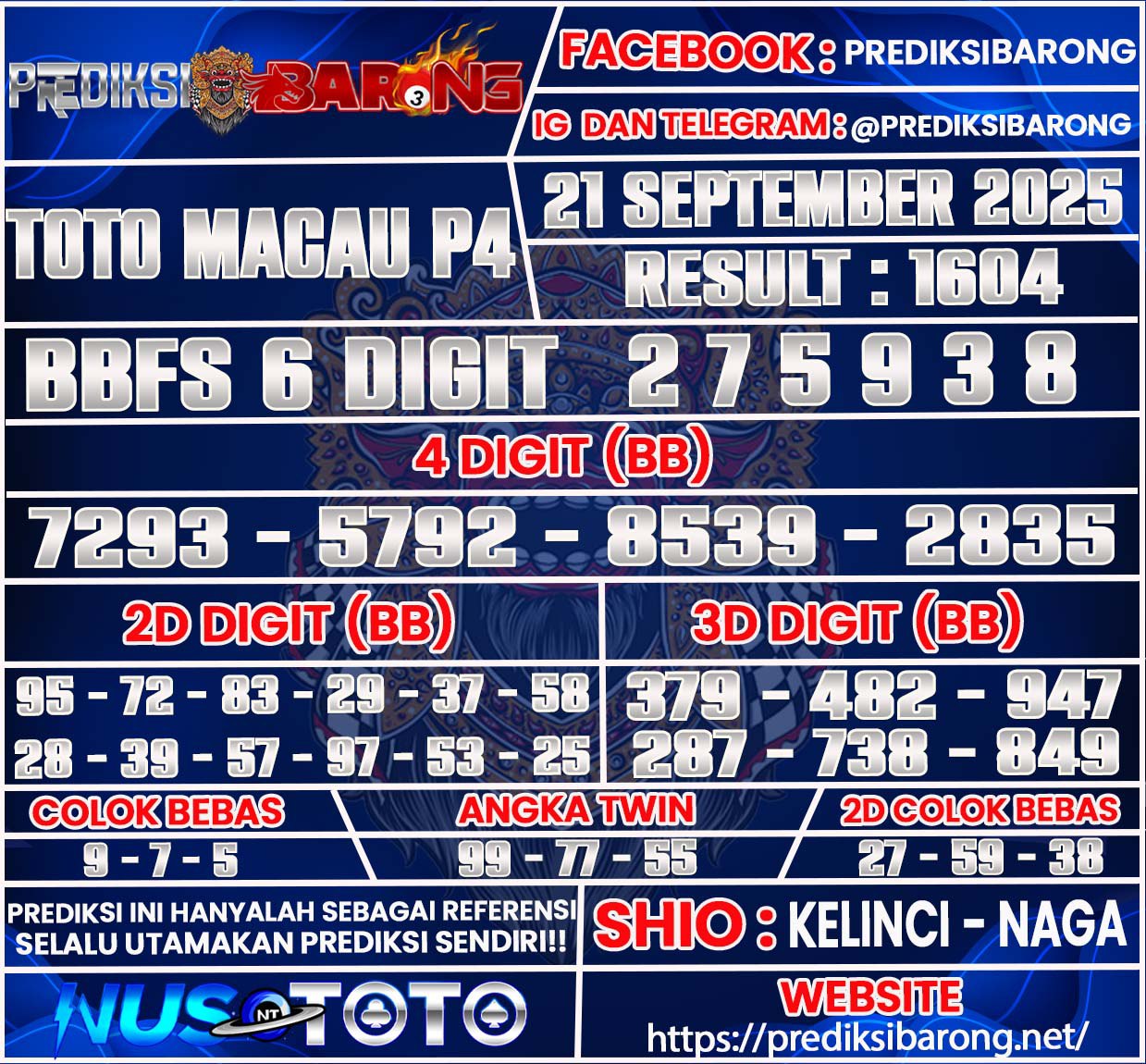 slamat datang di Situs Prediksi Barong. Prediksi Barong merupakan situs prediksi angka togel yang berasal dari situs togel terpercaya dan teramanah yaitu NUSTOTO. Prediksi Barong sendiri sudah berdiri dari tahun 2018 hingga sekarang dan kualitasnya sudah di uji oleh para ahli paito dan pecinta togel resmi. Hari ini Prediksi Barong telah menyediakan Prediksi Toto Macau P4 Minggu 21 September 2025 untuk anda semuanya.