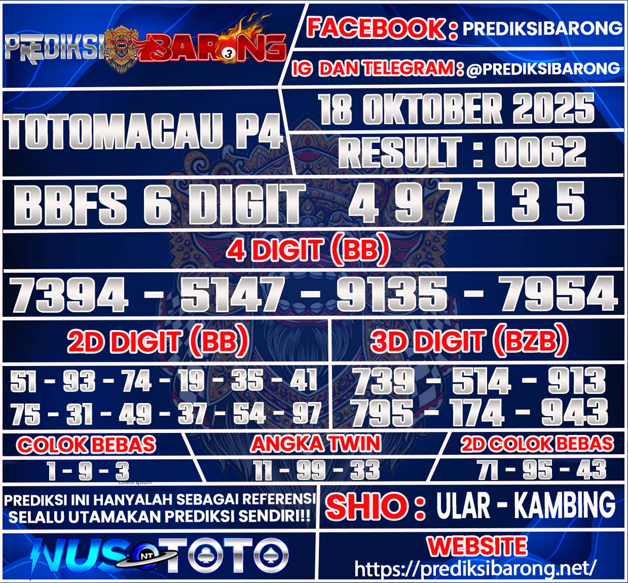 Prediksi Barong adalah layanan prediksi togel yang dirancang khusus untuk membantu para pemain togel dalam meraih keberuntungan. Pada edisi kali ini, kami menyajikan prediksi togel untuk pasar Toto Macau P4 pada hari Sabtu 18 Oktober 2025. Dengan analisis mendalam dan metode yang telah terji, kami berusaha memberikan angka-angka yang memiliki potensi tinggi untuk keluar. Prediksi ini tidak hanya berdasarkan keberuntungan semata, tetapi juga menggunakan data statistik dan pola permainan sebelumnya yang dapat memberikan wawasan lebih bagi para pemain.