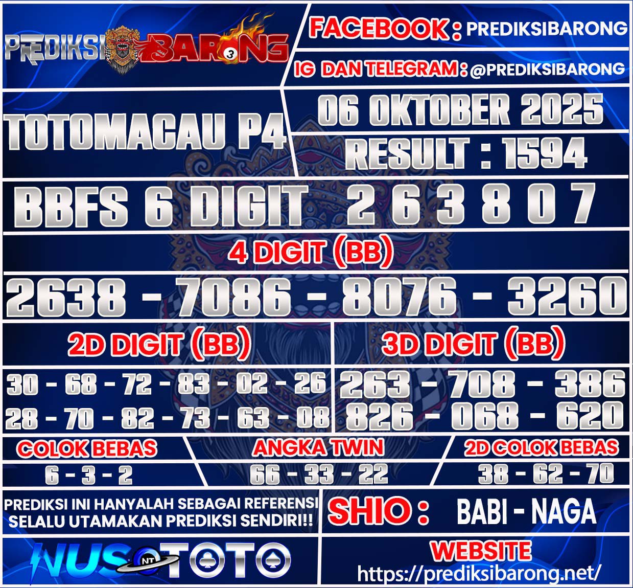 Prediksi Barong adalah layanan prediksi togel yang dirancang khusus untuk membantu para pemain togel dalam meraih keberuntungan. Pada edisi kali ini, kami menyajikan prediksi togel untuk pasar Toto Macau P4 pada hari Senin 06 Oktober 2025. Dengan analisis mendalam dan metode yang telah terji, kami berusaha memberikan angka-angka yang memiliki potensi tinggi untuk keluar. Prediksi ini tidak hanya berdasarkan keberuntungan semata, tetapi juga menggunakan data statistik dan pola permainan sebelumnya yang dapat memberikan wawasan lebih bagi para pemain.
