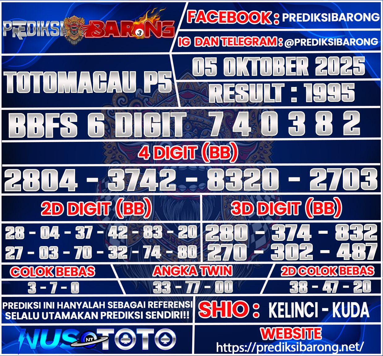 selamat datang di Situs Prediksi Barong. Prediksi Barong merupakan situs prediksi angka togel yang berasal dari situs togel terpercaya dan teramanah yaitu NUSTOTO. Prediksi Barong sendiri sudah berdiri dari tahun 2018 hingga sekarang dan kualitasnya sudah di uji oleh para ahli paito dan pecinta togel resmi. Hari ini Prediksi Barong telah menyediakan Prediksi Toto Macau P5 Minggu 05 Oktober 2025 untuk anda semuanya. Apa Itu Prediksi Barong?