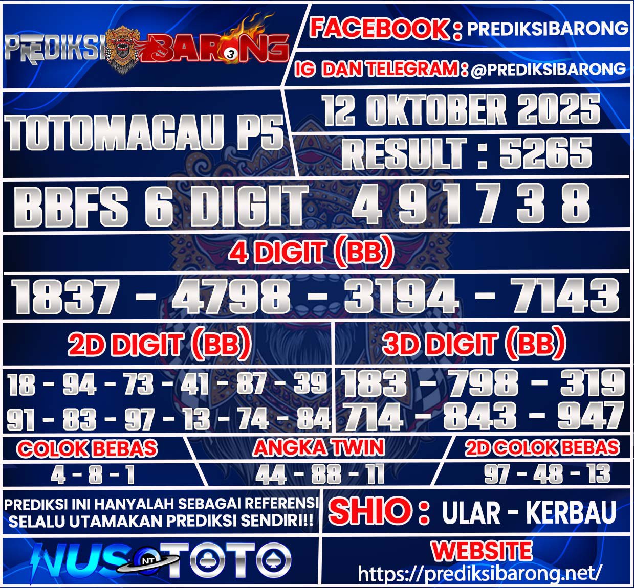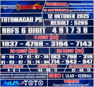 Prediksi Barong adalah layanan prediksi togel yang dirancang khusus untuk membantu para pemain togel dalam meraih keberuntungan. Pada edisi kali ini, kami menyajikan prediksi togel untuk pasar Toto Macau P5 pada hari Sabtu 11 Oktober 2025. Dengan analisis mendalam dan metode yang telah teruji, kami berusaha memberikan angka-angka yang memiliki potensi tinggi untuk keluar. Prediksi ini tidak hanya berdasarkan keberuntungan semata, tetapi juga menggunakan data statistik dan pola permainan sebelumnya yang dapat memberikan wawasan lebih bagi para pemain.