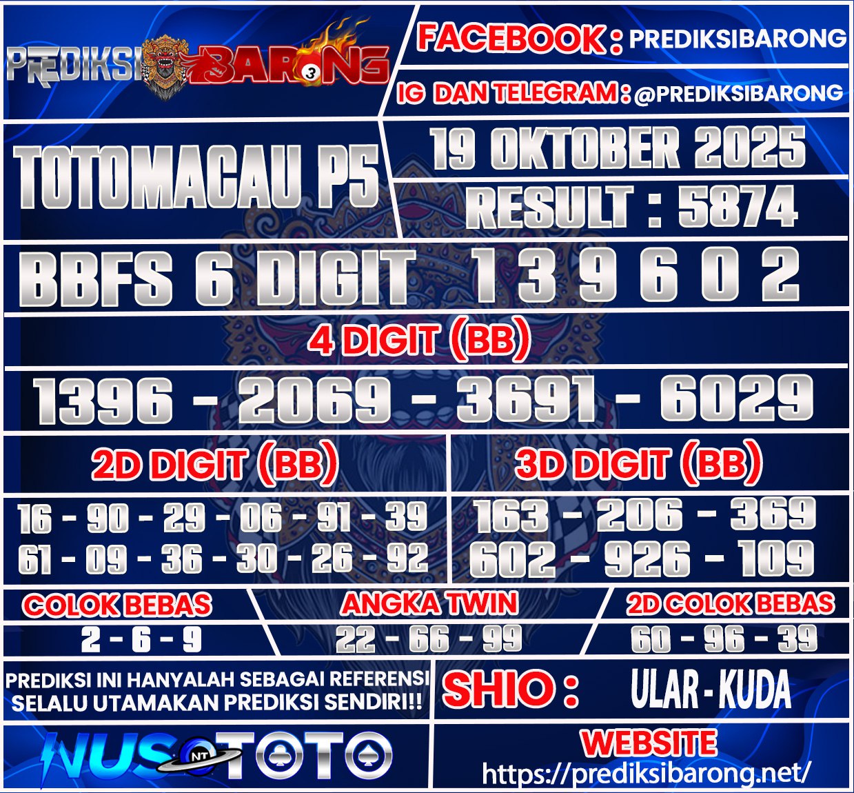 Oleh karena itu tanpa menunggu lama inilah Prediksi Toto Macau P5 Minggu tanggal 19 Oktober 2025 2025 Dari Prediksi Barong :