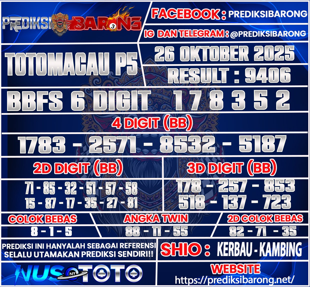 Prediksi Barong adalah layanan prediksi togel yang dirancang khusus untuk membantu para pemain togel dalam meraih keberuntungan. Pada edisi kali ini, kami menyajikan prediksi togel untuk pasar Toto Macau P5 pada hari Sabtu 18 Oktober 2025. Dengan analisis mendalam dan metode yang telah teruji, kami berusaha memberikan angka-angka yang memiliki potensi tinggi untuk keluar. Prediksi ini tidak hanya berdasarkan keberuntungan semata, tetapi juga menggunakan data statistik dan pola permainan sebelumnya yang dapat memberikan wawasan lebih bagi para pemain.