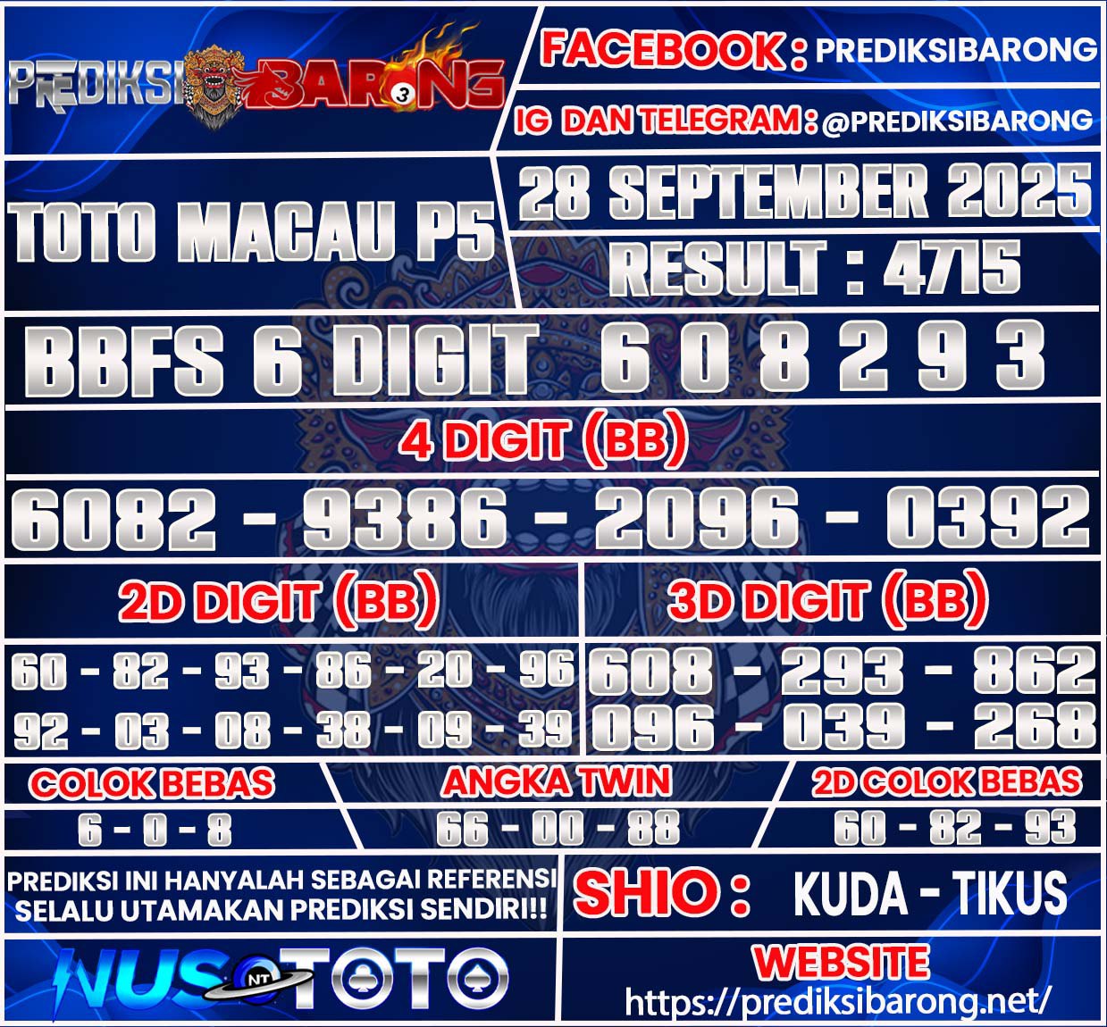 Prediksi Barong adalah layanan prediksi togel yang dirancang khusus untuk membantu para pemain togel dalam meraih keberuntungan. Pada edisi kali ini, kami menyajikan prediksi togel untuk pasar Toto Macau P5 pada hari Minggu 28 September 2025. Dengan analisis mendalam dan metode yang telah teruji, kami berusaha memberikan angka-angka yang memiliki potensi tinggi untuk keluar. Prediksi ini tidak hanya berdasarkan keberuntungan semata, tetapi juga menggunakan data statistik dan pola permainan sebelumnya yang dapat memberikan wawasan lebih bagi para pemain.