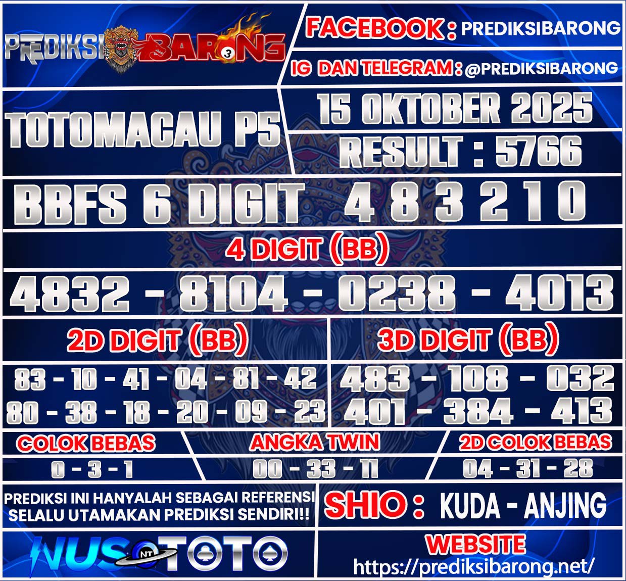 Prediksi Barong adalah layanan prediksi togel yang dirancang khusus untuk membantu para pemain togel dalam meraih keberuntungan. Pada edisi kali ini, kami menyajikan prediksi togel untuk pasar Toto Macau P5 pada hari Selasa 14 Oktober 2025. Dengan analisis mendalam dan metode yang telah teruji, kami berusaha memberikan angka-angka yang memiliki potensi tinggi untuk keluar. Prediksi ini tidak hanya berdasarkan keberuntungan semata, tetapi juga menggunakan data statistik dan pola permainan sebelumnya yang dapat memberikan wawasan lebih bagi para pemain.